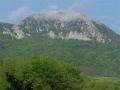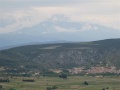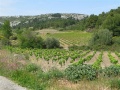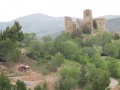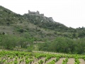 Second jour, de Durban vers Tuchan. Quel est ce château ? On en a tellement vus, durant ces deux semaines. D'après l'heure, le château de Durban. |  Changement de paysage : on est maintenant dans des chaînons calcaires, la végétation est très belle, tout est en fleurs. Mais nos pieds souffrent des nombreux petits raidillons, bien pentus. |  Arrivée en vue du château d'Aguilar, dominant les vignes fraîchement taillées. On pense à toutes ces bouteilles de Corbières, qui vont sortir de là. |  Vue sur le massif du Canigou. On dit à Béziers que quand on voit le Canigou, il va pleuvoir dans les prochains jours. Vrai. |