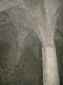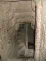 On visite le château, planté sur un piton escarpé. L'escalier d'accès est impressionnant ! (ce n'est pas l'escalier en bois visible sur la photo, mais une longue rampe taillée dans la pierre et passablement raide). |  La salle du pilier, dans le donjon. |  Escalier dans le mur. |  Après Cucugnan, la route vers Duilhac. |