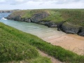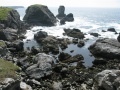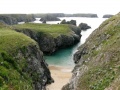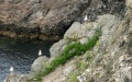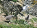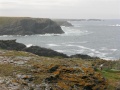Vers la grotte de l'Apothicairerie. La mer entame la roche et creuse de nombreuses grottes, fissures, abers, et découpe la côte en dentelle. |  C'était probablement la période de couvaison et d'élevage des petits goélands. Nous verrons régulièrement les oiseaux couver, ou garder des petites boules en duvet tacheté. |  Le plateau et sa végétation adaptée aux vents humides, froids, salés. |  L'une des nombreuses criques : Port de Kerlédan, Port Skeul, Port de Donnant... |
