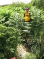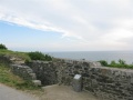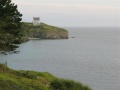 On a un peu l'impression d'être surveillé. |  On dépasse Sauzon pour aller voir la Pointe des Poulains, extrémité nord-ouest de l'île. Le paysage devient un peu plus sauvage : falaises noires plus hautes, houle plus forte. Et encore, il fait beau aujourd'hui. |  Le phare de la pointe des Poulains. A cet endroit se trouve aussi une résidence qu'avait achetée Sarah Bernard. Il y a un musée, qu'on ne visitera pas. |  Et le soir, repos au gîte (enlever les godasses de marche fumantes, se laver, se masser les mollets). C'est l'heure où apparaît l'Elastoplast. |
