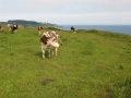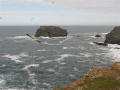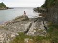 Matinée du second jour. Nous sommes maintenant sur la façade ouest de l'île, en train de descendre plein sud (comme des vrais petits matelots, nous avons notre compas devant les yeux). Le sentier longe le bord de l'océan : sur la falaise, descente vers les criques (les ports comme ils disent), un peu de plage, remontée sur la falaise d'en face. |  C'est bien plus élevé de ce coté de l'île, se plaignent nos mollets. Mais bien plus sauvage aussi, plus beau. Toute la journée, nous respirons les embruns du large. |  Sur le plateau, fini les vaches ; c'est pelé, ras. Des herbes dures, des buissons. |  La côte est parsemée d'îlots rocheux. |