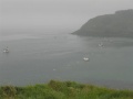 Après avoir tourné autour de la Pointe du Skeul, point le plus au sud, on repart vers le nord-est en direction de la plage de Port Blanc. C'est ici que le chemin part vers Locmaria, dernière des quatre communes de l'île. Dernière nuit de la randonnée. Et miracle : un restaurant qui sert des poissons. |  Ah quand même, le temps breton. Une petite pluie très fine, un air un peu plus frais. |  Locmaria : un joli petit village de marins. |  Port Maria, sous la brume. |