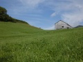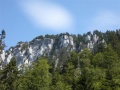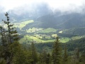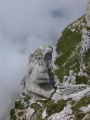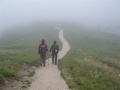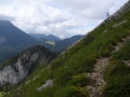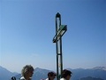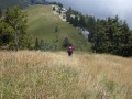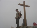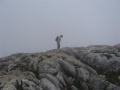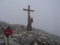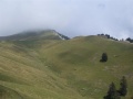 Après la forêt, on débouche sur des dalles calcaires, et au-dessus des alpages. |  Sommet dans le brouillard. |  Comme sur tous ces massifs, une croix. |  |