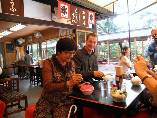 Halte rafraichissement dans un temple. C'est de la glace finement pilée arrosée de sirop parfumé ou de thé macha, et sous la glace des haricots rouges plutôt sucrés.