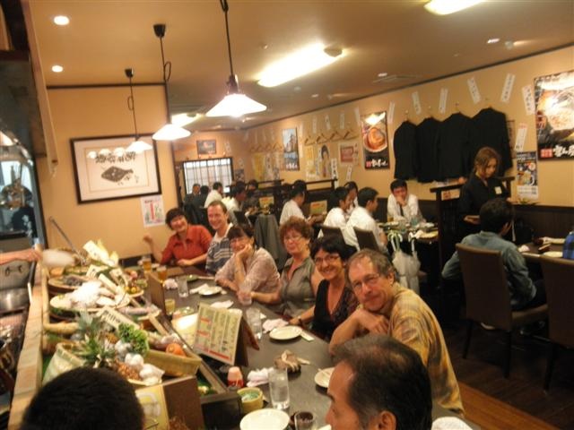 Repas du soir dans un restau pour salarymen. C'est à dire, vers 18 - 19 heures, un tas de restaus se remplissent d'hommes en costard-cravate gris. Ils tombent la veste, ouvrent la cravate, et mangent et boivent (bière Kirin, bonne, saké).