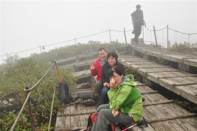 Au sommet du Mont Daisen. En bas : 28 °, en haut : moins de 10 °, humidité, vent froid.