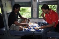 |  |  Durant le voyage, nos voisins indiens n'arrêtent pas de manger. |  A chaque arrêt, des vendeurs de tout : boissons fraiches, tchai, coffee, samossas, thalis, bibelots, etc. |