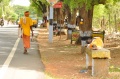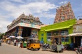 Très calme, dans la lumière rose du soir. |  |  Changement d'atmosphère, après être arrivé, en train, à Madurai. |  Ce qui est intéressant, à Madurai, c'est le grand temple de Meenakshi, femme de Shiva. Tous les deux ont leur "appartement" dans le temple. Chaque soir à 21 heures on transporte Shiva, en grande pompe et accompagné d'une troupe de brahmanes et de fidèles, depuis son sanctuaire vers celui de Meenakshi. |