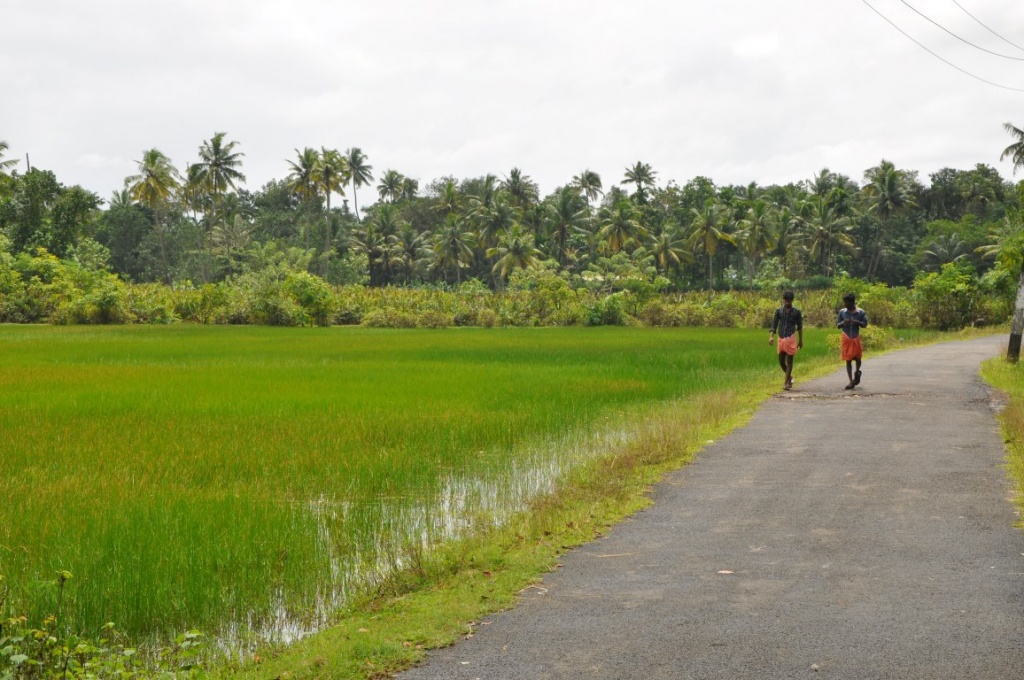 Promenade dans la campagne entourant le village. L'habitat est dispersé, au milieu de plantations, de rizières, de palmiers.