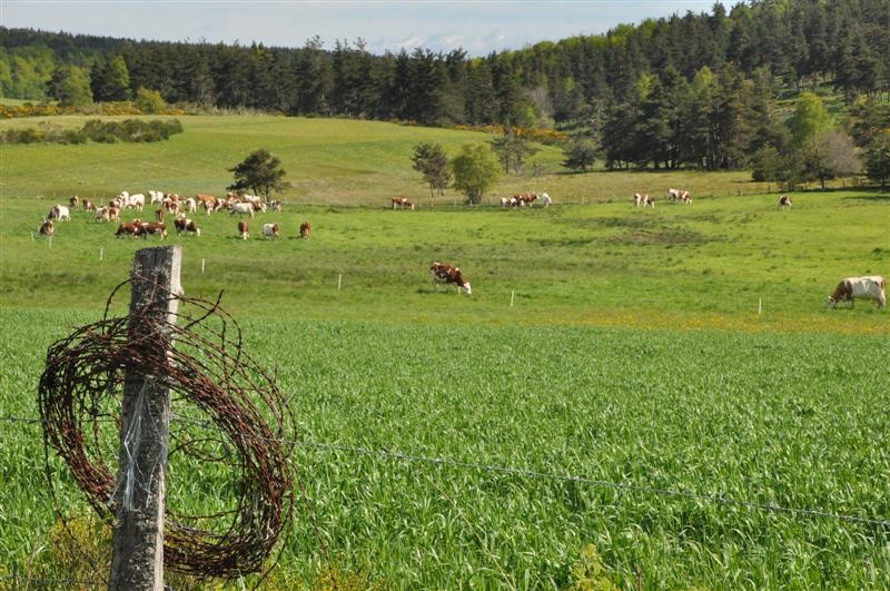 Typique paysage lozérien : des forêts, des prés, des vaches et des clôtures en fil de fer barbelé rouillé.