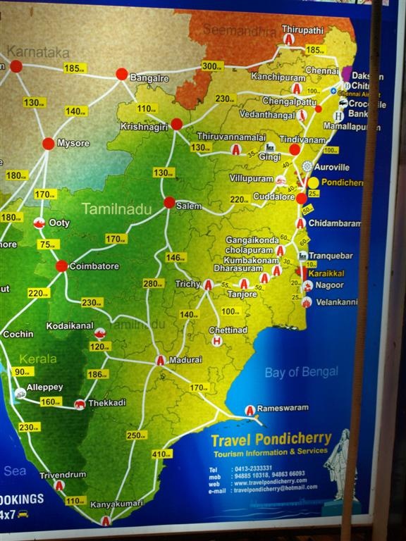 Je vous laisse trouver les étapes sur la carte : Chennai - Tiruvannamalai (ashram Sri Ramana Maharshi) - Pondicherry - petites villes plus au sud (Chidambaram, Karaikkudi dans le Chettinad, Rameswaram sur la côte) - Madurai - les Ghâts occidentaux à Kodaikanal et Elephant Valley puis retour à Chennai.