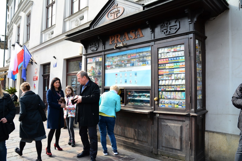 Nombreuses guérites, stands, où l'on achète des cigarettes, la presse, des espèces de bretzels.