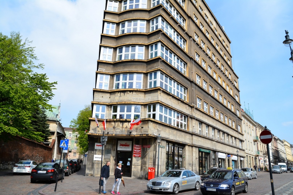 Immeuble de l'ère soviétique. Il y a une pancarte : Solidarnosc.
