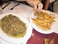 ![]() A Cordoue, pour moi c'est un lieu mythique : la Mezquita. L'une des plus anciennes et des plus grandes mosquées au monde, construite à partir du 8 ème siècle. C'est difficile à montrer en photos, tellement c'est grand. Et en plein milieu, au 13 ème, ils ont démoli et construit une cathédrale moche. Allez voir de belles photos sur : http://fr.wikipedia.org/wiki/Mezquita | ![]() Dans la Mezquita, l'approche vers le Mirhab. | ![]() Plafond de la cathédrale ; ce coté n'est pas trop moche. | ![]() Et après une visite : un bon remontant. C'étaient des fèves et des aubergines frites. |