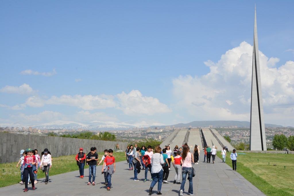 Mémorial du génocide de 1915, placé au sommet d'une colline en bordure de la ville. Je profite de cette photo pour terminer de parler, très sommairement, de l'histoire arménienne. Rappel : à partir du 16ème siècle et jusqu'à la fin du 19ème, le pays, beaucoup plus vaste qu'actuellement, se compose de 2 parties : l'Arménie occidentale, sous contrôle ottoman, et l'Arménie orientale, d'abord sous contrôle des Perses puis des Russes. Les Turcs, suite aux conflits avec les Russes, durcissent peu à peu leurs positions et commencent à réprimer les Arméniens. En 1908 le parti Jeunes-Turcs prend le pouvoir ; peu à peu l'idée de créer une "Grande Turquie" musulmane, avatar de l'Empire ottoman, prend place. Le drame se joue durant la Première guerre mondiale, quand les Turcs, alliés aux Allemands, sont défaits par les Russes. En 1915, les Jeunes-Turcs, en guise de vengeance, organisent le génocide des Arméniens vivant en Arménie occidentale.