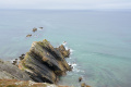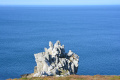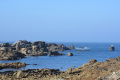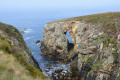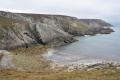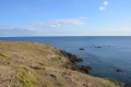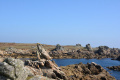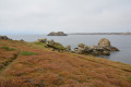 Sur le plateau s'étend une lande basse et épineuse d'ajoncs et de bruyères. |  On domine la mer sur plusieurs dizaines de mètres, le sentier peut être dangereux (éboulements). |  Une petite anse : Penn ar Ru Meur. |  |