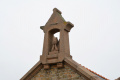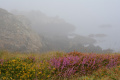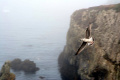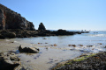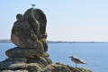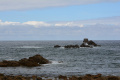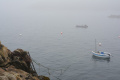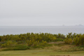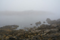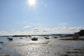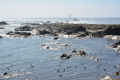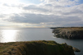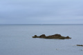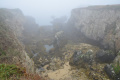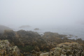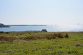 Deux poules faisanes nous indiquent le chemin vers la côte. On voit aussi des lapins gambadant dans les champs. |  A marée basse, la mer découvre des anses rocheuses profondes et escarpées. |  |  En face l'Ile de Keller a du mal à sortir de la brume. |