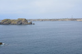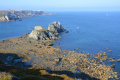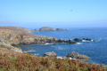 Sous le ciel bleu, départ pour le sentier côtier qui fait le tour de la corne nord-ouest de l'île. Le phare de Creac'h balise l'itinéraire. |  |  Aujourd'hui, l'Ile de Keller est bien plus visible. |  |