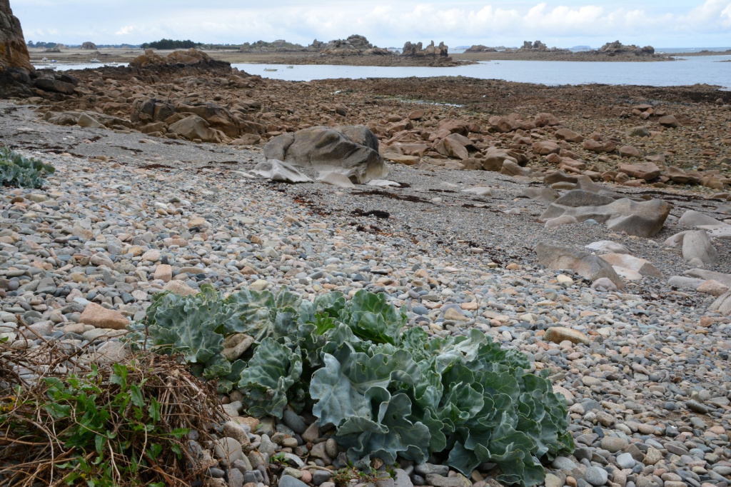 Choux marin. Éviter de marcher sur le sommet des dunes de galets : risques de casser des plants, et aussi d'écraser des œufs du gravelot, oiseau qui pond directement sur les cailloux.