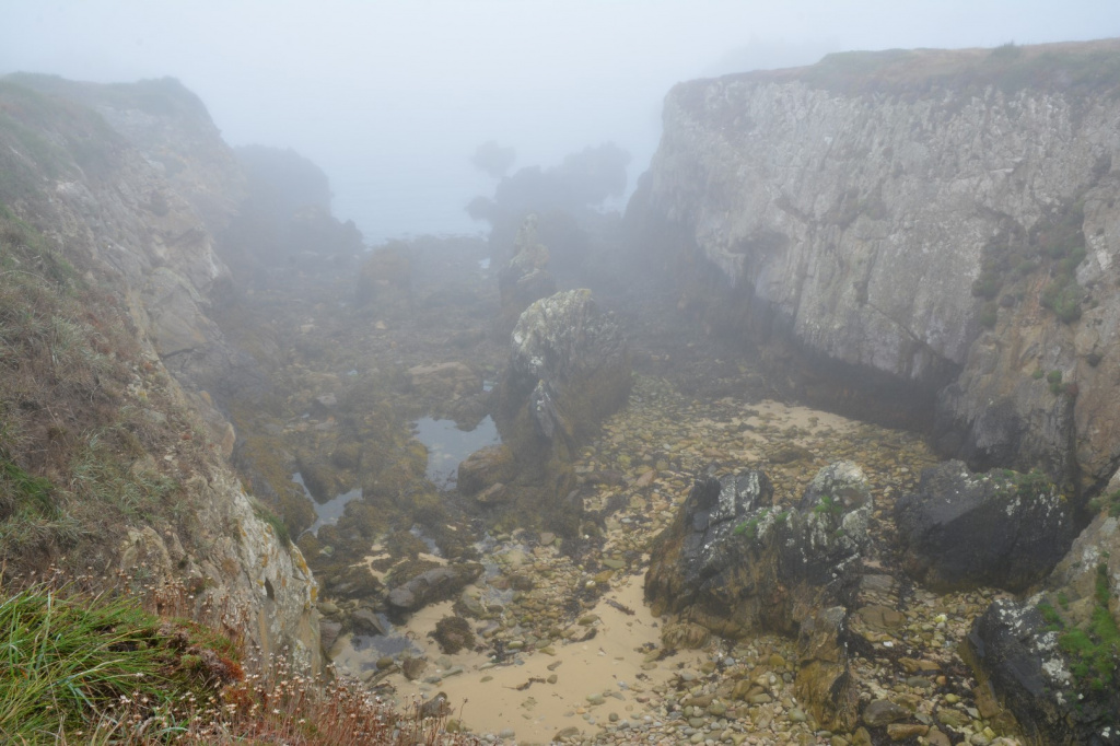 A marée basse, la mer découvre des anses rocheuses profondes et escarpées.