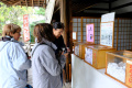 Dernier jour à Takayama. On se promène dans les vieux quartiers ; vers un hall où sont exposés les chars utilisés lors de festivals. |  |  Dans les rues, des kiosques permettent d'apaiser une petite faim. Ici, on vend des dango, brochettes de boulettes de farine de riz gluant. |  Une boutique de sashiko (broderie dite grain de riz). |