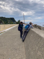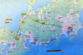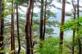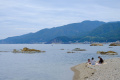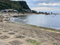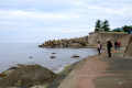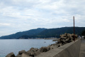 |  Samedi 25 octobre, le temps n'est pas terrible, mais nous allons quand même, moyennant une heure de bus, au bord de la Mer du Japon. |  Echizen-seaside est une agglomération allongée, coincée entre le rivage et la montagne boisée. La côte est rocailleuse, il n'y a pas vraiment de plage. |  Et pas la foule, non plus. |