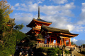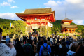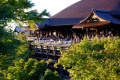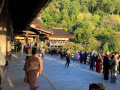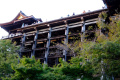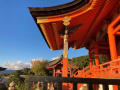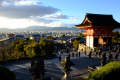 |  Cet itinéraire nous permet de rejoindre le chemin montant vers le 3ème temple que nous voulons visiter : Kiyomizu-dera. |  Comme écrit dans le Lonely Planet "ce n'est pas une oasis de tranquillité". Mais c'est grand et splendide. On domine légèrement la ville étalée dans sa cuvette, et le soleil couchant illumine les bâtiments. |  |