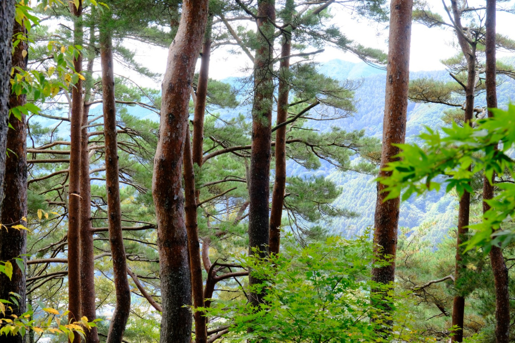 Du temple, on peut voir, au loin entre les arbres, le mont Ontake-san, volcan actif culminant à 3000m. Second volcan du Japon, en altitude, après le Fuji-san.