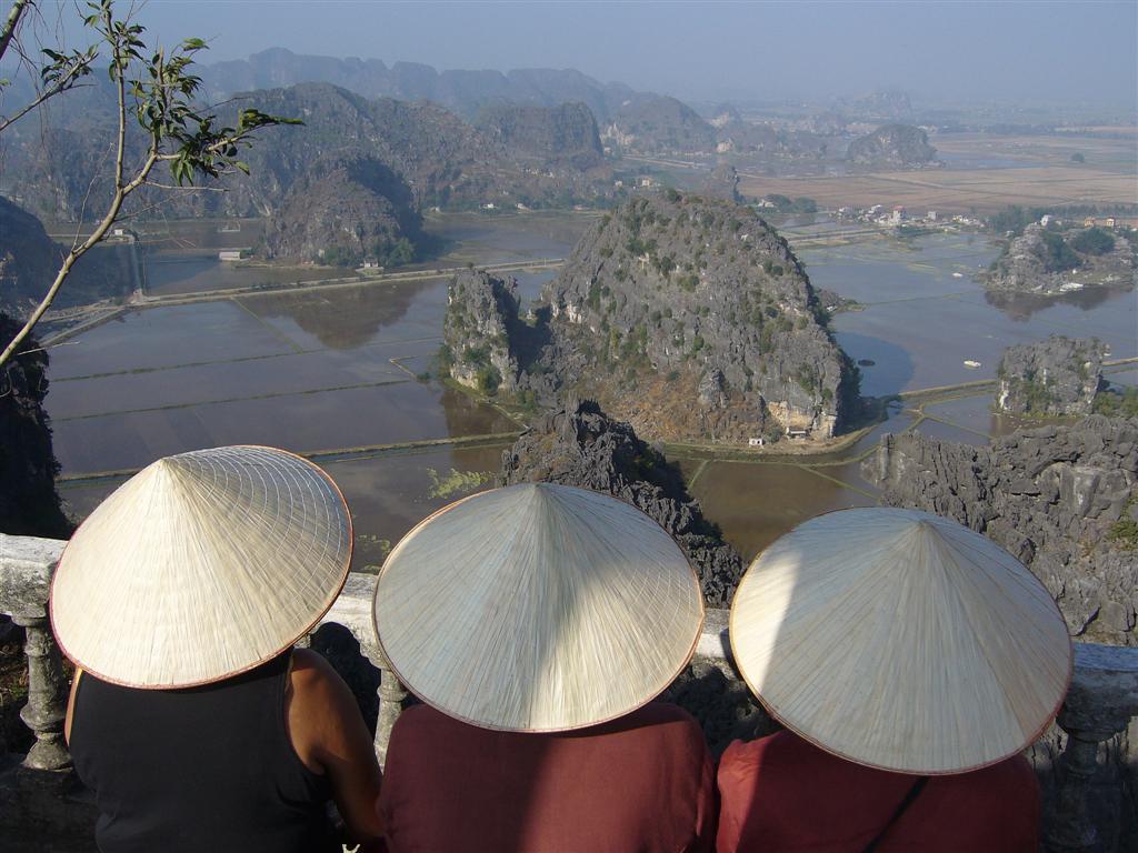 Trois françaises sous trois chapeaux pointus contemplent les montagnes de Tam Coc (la montée des marches a été rude ! )