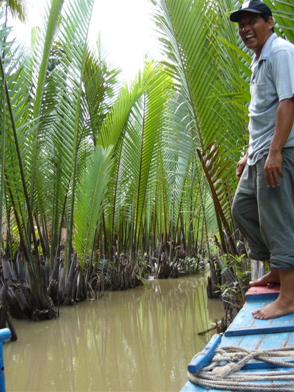 Ben Tre, petite ville dans le delta du Mékong ; encore une fois en bateau sur les canaux d'où l'on a pu voir des montagnes de noix de coco débarquées pour être décortiquées.