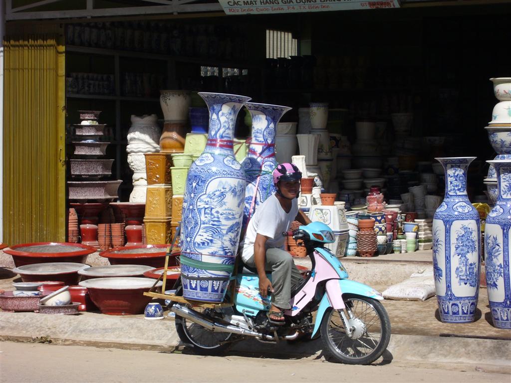 Qui oserait chez nous, livrer 2 vases chinois ficelés sur une moto ? Il a fait un impeccable demi-tour et s'est lancé dans la circulation !