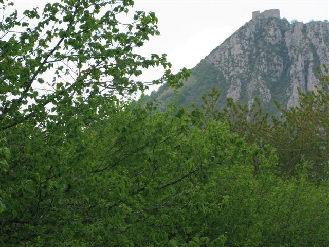 Premières vues sur la forteresse de Montségur, sur son piton rocheux.