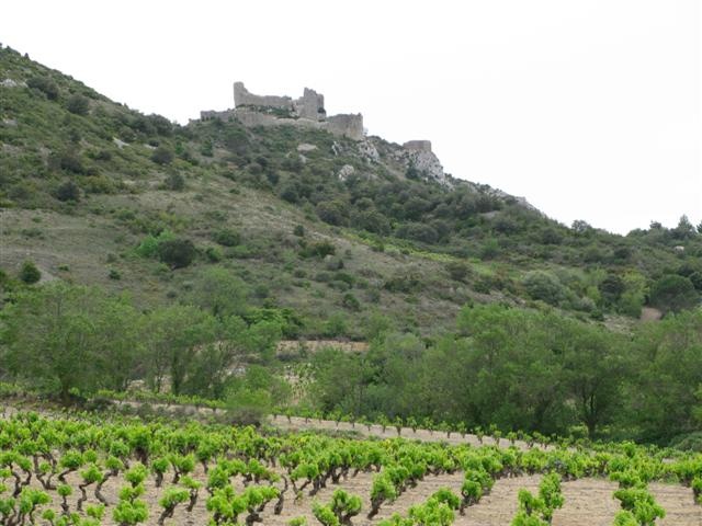 Arrivée en vue du château d'Aguilar, dominant les vignes fraîchement taillées. On pense à toutes ces bouteilles de Corbières, qui vont sortir de là.
