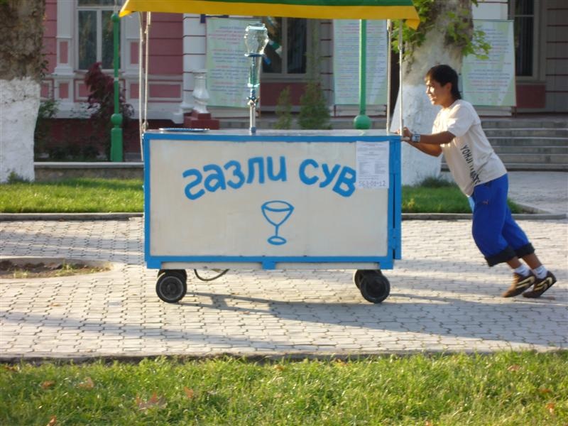 Marchand ambulant d'eau avec gaz. Il y en a souvent, dans les villes. L'eau est souvent colorée ; par quoi ?