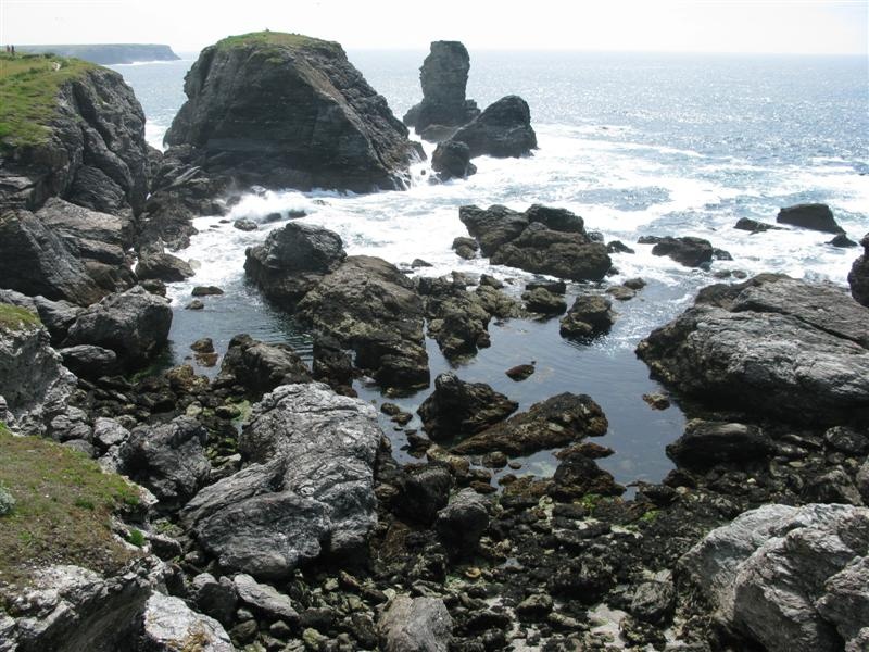 On dépasse Sauzon pour aller voir la Pointe des Poulains, extrémité nord-ouest de l'île. Le paysage devient un peu plus sauvage : falaises noires plus hautes, houle plus forte. Et encore, il fait beau aujourd'hui.